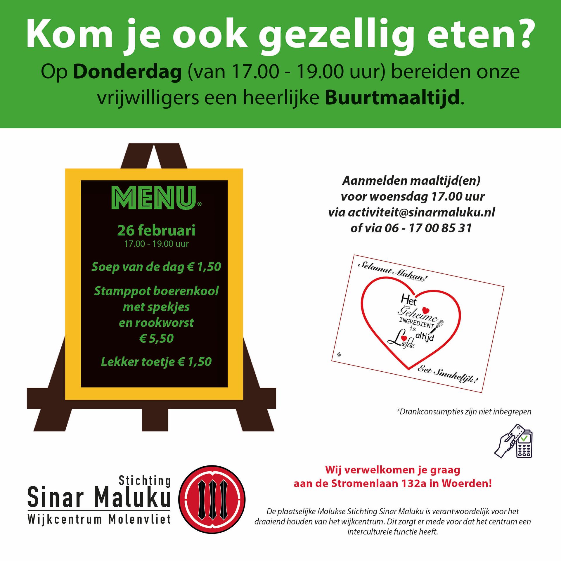 Reserveren/aanmelden vóór woensdags voor 17:00 via 06 17008531 | Afhalen is ook mogelijk.