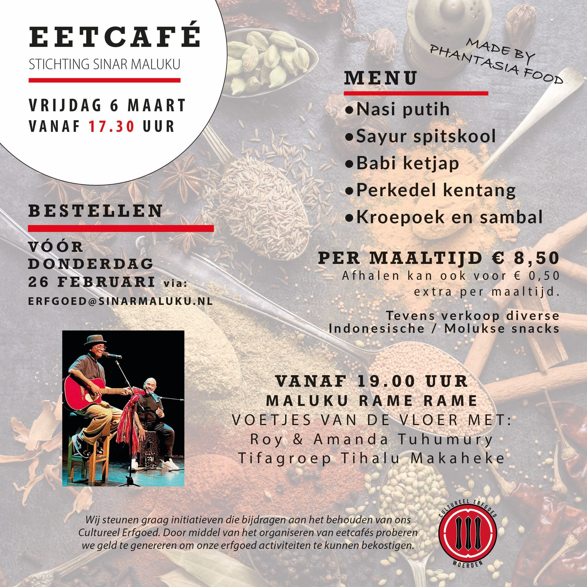Doelstelling: geld genereren voor onze Molukse Culturele activiteiten met Moluks/Indische maaltijden.