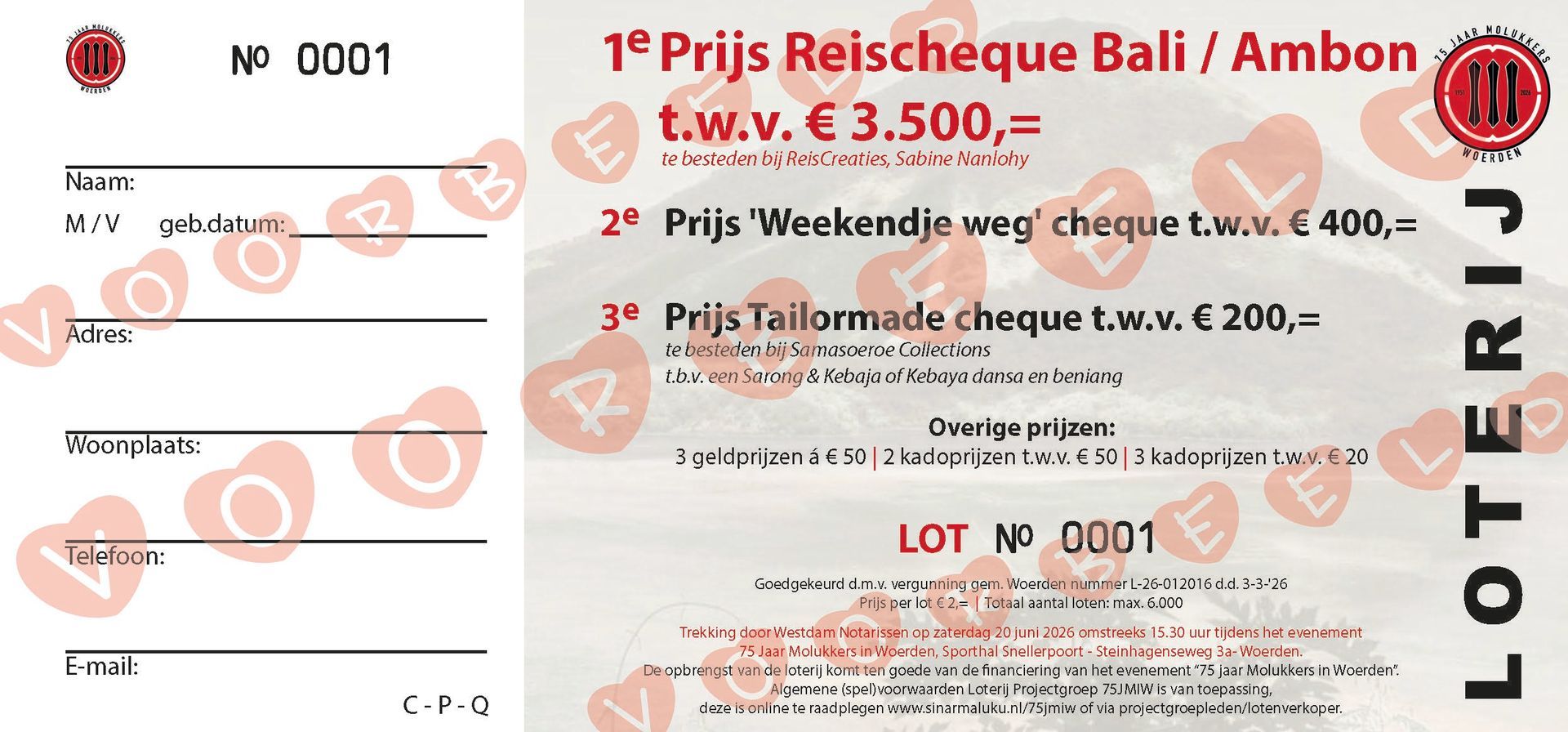 Deze loterij wordt georganiseerd ten behoeve van de financiering van de kosten voor het evenement 75 Jaar Molukkers in Woerden. De trekking van de loterij vindt plaats tijdens het evenement omstreeks 15.30 uur op zaterdag 20 juni 2026 in Sporthal Snellerpoort, Steinhagenseweg 3a te Woerden. Door het kopen van een of meerdere loten, verklaren de deelnemers zich akkoord met de toepasselijkheid van de